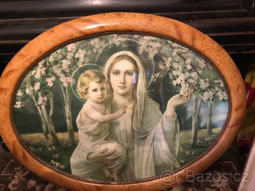Velký oválný obraz se svatým motivem. Silný dřevěný rám. Jedná se o fotografii. Kryto sklem. Rozměry 115 cm krát 85 cm