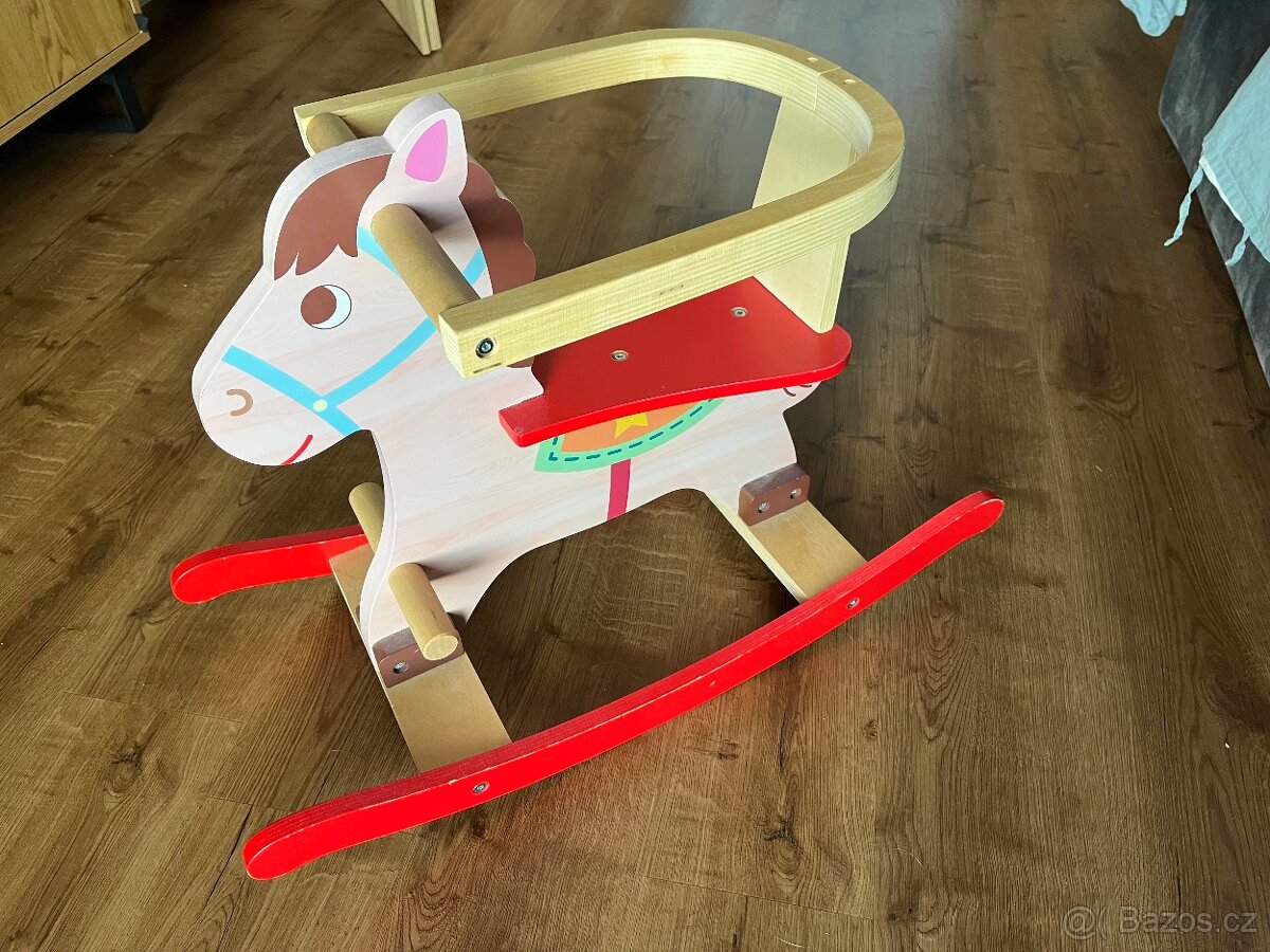 Dřevěný houpací koník s oddělávací zábranou pro malé děti. Osobní předání Doubravčice a okolí.