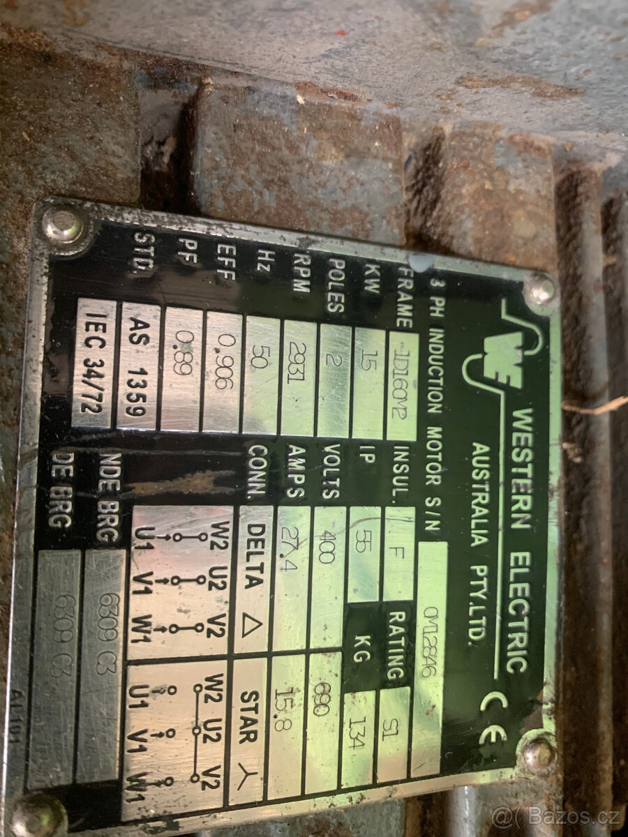 Prodám elektromotor 15kW, 2931/ot. 400V. Motor po kontrole servisní opravnou. Cena 12 000,-Kč