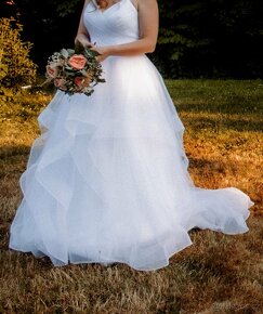Svatební šaty s jednoduchým korzetem a nadýchanou tylovou sukní s volánky. Vel. 38-40, na šněrování. Kruhová spodnička zdarma. Vyčištěné z čistírny, spodní lem sukně však nebylo možné více vyčistit (viz foto) - není vidět při nošení. Doporučuji vyzkoušet, vzít s sebou boty. Původní cena 10 000,- Kč