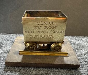 Těžítko dekorace Důlni vozík rozměr desky 12x8 cm,vozík 6,5x4 cm
