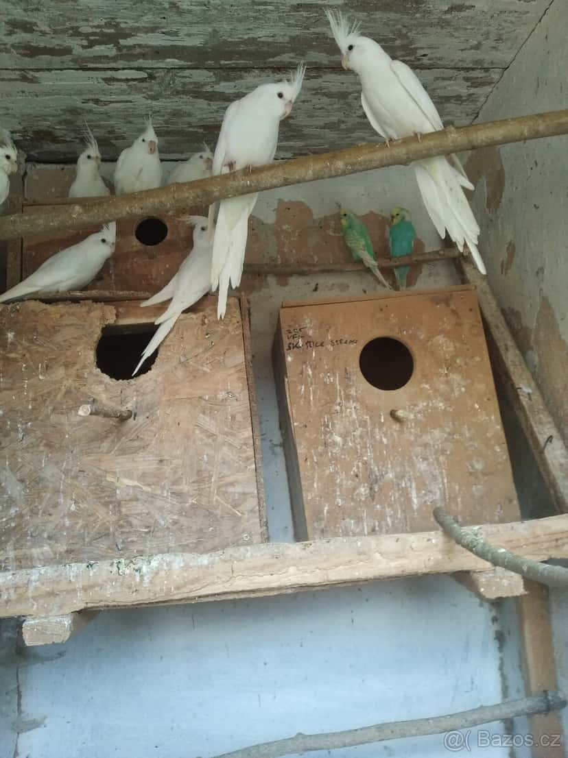 Loňské korely albíno , straky cena 400 Kč kus, zebřičky rudoprsé 250Kč kus info tel.72528158