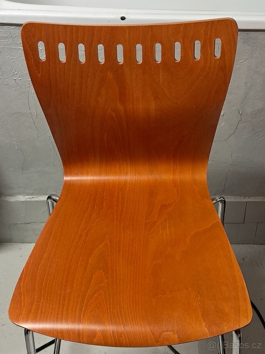 Nabízím k prodeji 2 barové židle, používané, byly trochu sníženy, jedna výška sedu 57cm, druhá 63cm. Jedna židle má zezadu lehce vyšišovanou barvu. Materiál buková překližka, nohy pochromovaná ocel. Pouze osobní odběr.