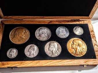 Predam LOT medaily T.G. MASARYK v novej drevenej etui. Zlozenie.60mm bronz vyročna,50mm Ag vyročna,42mm Ag vyročna,32mm Ag vyročna. 60mm bronz umrtna,50mm Ag umrtna,40mm Ag umrtna,30mm Ag umrtna.Medaile su v peknom ,povodnom zbierkovom stave. Cena 18000Kč+200Kč poštovne/osobne predanie Praha