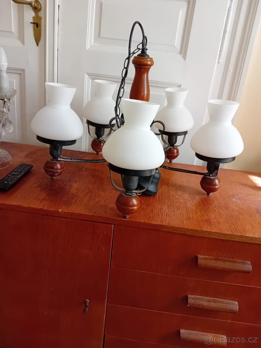 Prodám 5-ti ramenný lustr v kombinaci dřeva a kovu. Pouze osobní odběr, platba hotově.