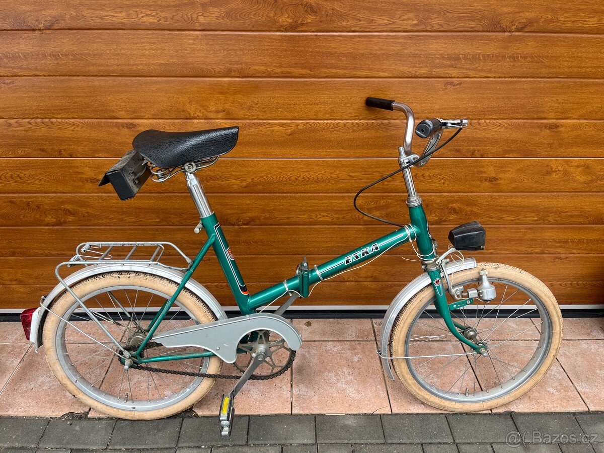 Skládací kolo Eska plně pojízdná, krásný stav. Dynamo jsem nezkoušel, případně mohu přidat funkční. Velmi pěkný retro kousek.