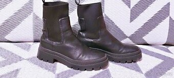 Kožené pánské kotníkové kozačky - spíš přechodové - černé - velikost 41 - štítek výrobce se bohužel odlepil...Vnitřní stélka 26,5cm - podrážka vyšší,se vzorkem,na bocích pružné vsadky,nad patou poutko pro snažší nazouvání..Výška boty v kotníkové části 23cm,vrchní lem 2 x 12,5 cm,napla jsem až na 2 x 15cm...Podrážka je z tvrdší gumy,pohodlná na chůzi,dobře ohebná...Díky podrážce se boty jeví jako masívnější - dle mého by mohly být i unisex pokud by žena měla širší nohu...Nošené krátce,podrážka bez sešlapu,kolem špic bez okopnutí ,bez škrábanců a pod...