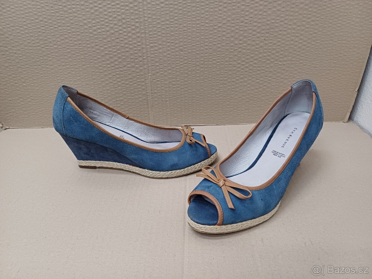 Modré kožené lodičky na klínku značky 5TH Avenue velikost psaná 41, klínek 7,5 cm, platforma 1,5 cm, šířka 8,5 cm, délka stélky 26,5 cm, minimálně použité nepoškozené viz foto. Cena 100,- + doprava / 79,- zásilkovna nebo 69,- balíkovna / platba na účet
