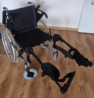 Mechanický invalidní vozík s polohovacími podnožkami Šíře sedu 47cm, celková šíře 66cm. Nosnost 125kg. Odklápěcí područky. Malá dírka v nožní opěrce, viz foto. Možno dokoupit I podsedák. Dovoz po celé ČR