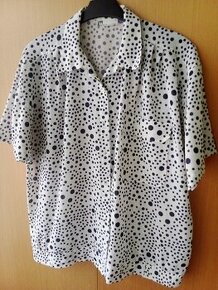 Lehká bílá halenka s tmavěmodrými puntíky, s krátkým rukávem, s kapsičkou na předním díle, rozzpínání na knoflíčky, dole lemovaná širším lemem. Vhodná pro silnější postavu.rozměr přes prsa 2x 65 cm, délka 70 cm. (3XL)