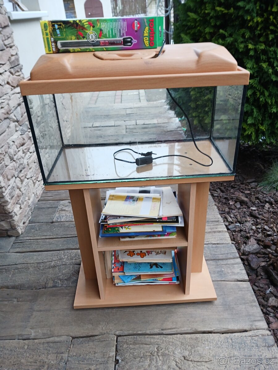 Prodám akvárium kompletní s topitkem a skříňkou-podstavcem.