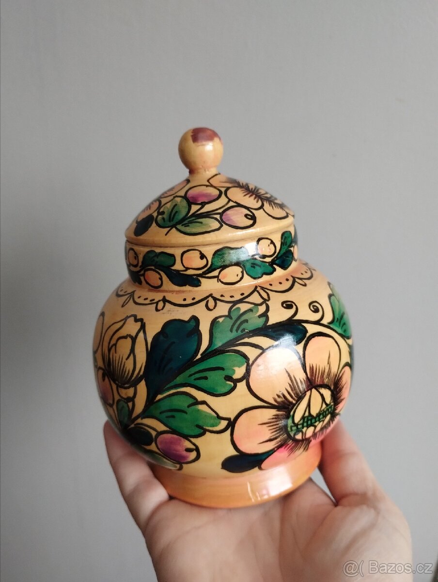 Retro. Ručně malovaná dřevěná šperkovnice / dóza na drobnosti, s víkem. Zdobena je barevnými květinovými motivy.