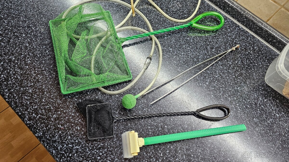 Cena: Dohodou. vzduchovací kompresory, skimmer, zářivka aqua glo, škrabka na řasy, malý filtr, porodnice, kameny kořen