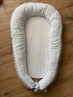 Hnízdečko bílo-šedé barvy, značky Scamp Pro novorozence, 0-6 měsíců Vnější potah: 100% bavlna Podložka: Kokos, latex Výplň: 100% antialergické silikonizované polyesterové vlákno - sem tam drobný prací žmolek jinak výborný stav a vyprané