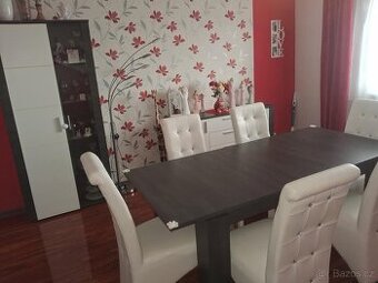Prodám jídelní sestavu, která se skládá z vysoké vitríny, komody, jídelního stolu a 6 židlí. Vysoká vitrína velmi pěkná V - 194cm, Š - 88,5cm, H - 34cm. Z půlky jsou dřevěné police 4 poličky a z půlky skleněné 5 polic. Komoda také pěkný stav jen na spodním šuplíku je malinko odřená viz.foto. V - 79CM, Š - 150cm, H - 42cm. Obě police jsou osvětleny. Jídelní stůl, rozkládací, pěkný stav D - 160cm, Š - 90cm, V - 77cm. Rozložený má 2m. Židle jsou také v pěkném stavu, jen sem tam je vidět nějaký flíček, od sezení, ale nic co by bylo nějak moc vidět, spíš při detailním zkoumání, snažila jsem se nafotit. POUZE VÁŽNÍ ZÁJEMCI!!! Cena za vše. Pouze osobní předání Vrbka