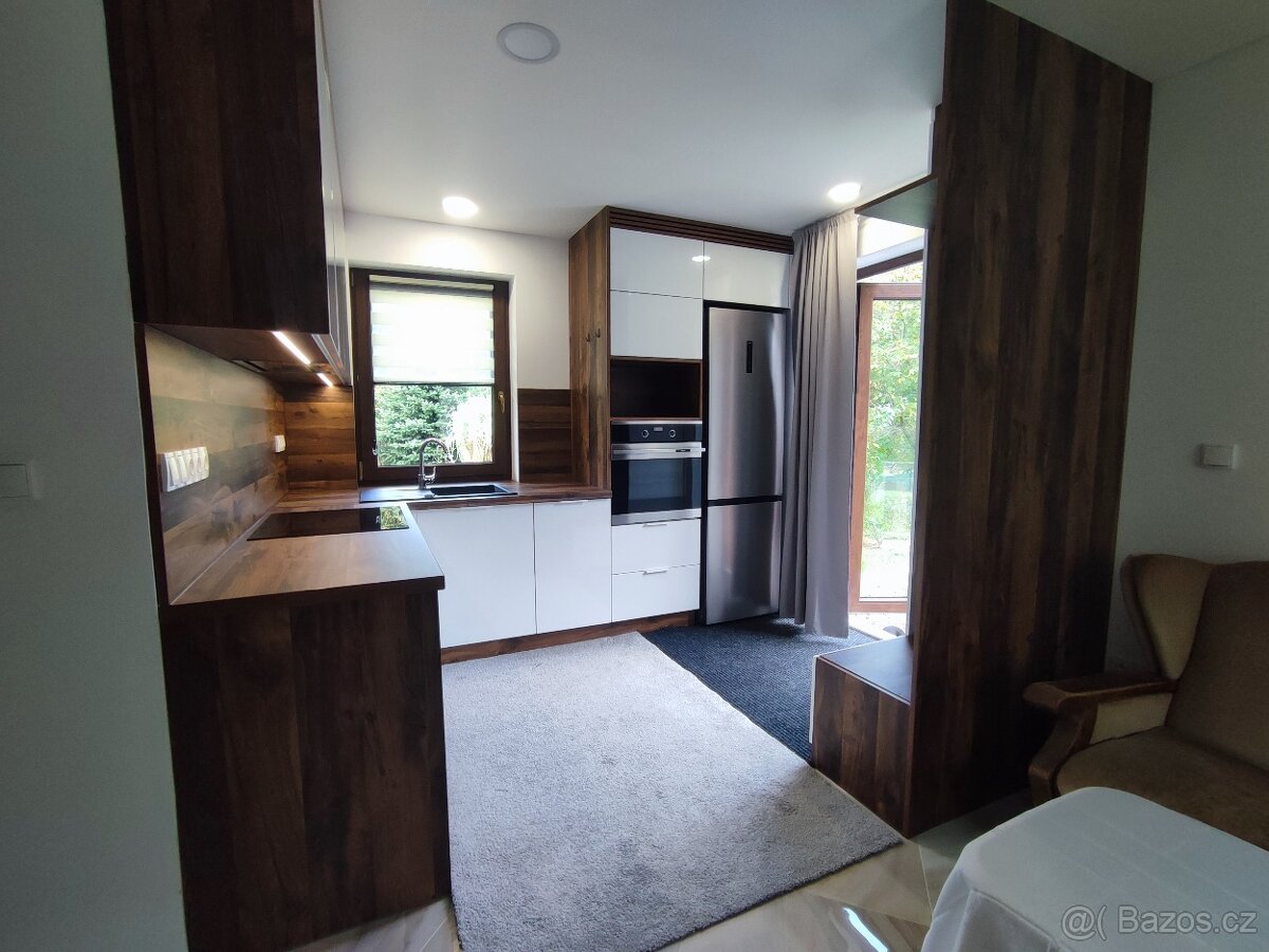 Cena: Dohodou. Nabízím k prodeji garsoniéru 1+kk, 27m2, s vlastní terasou s plochou 16m2, stáním na auto a zahradním koutem v nádherné přírodě uprostřed tří hor- Ostrého, Javorového vrchu a Hvězdy. Zde je pánem příroda a voda, která je i zdrojem pitné vody. Přitom je do města jen pouhÿch 9km, dálnice na Frýdek a Slovensko 7km. Horský potok se může stát i denním otužováním, procházky do hor Tvým odreagováním,lanovka k Javorovému vrchu krásným výhledem a nový byt Tvým kouzelným domovem. Dům má dvě samostatné bytové jednotky, ten nabízený je v 1NP. Je plně vybavený vestavným nábytkem na míru,spotřebiči,má španělskou dlažbu s podláhovým topením,okna trojskla až sedmikomorové, koupelnu v 3D obkladů, vanu a WC. Izolace v podlaze i ve stropě 30 cm. Dům je postaven z kvalitních materiálů jako je Porotherm, Prefa, střecha Creaton glazurovaná lesklá keramická taška. Dům má tepelné čerpadlo. Tento byt po stránce kvality materiálů, po stránce vnitřní výbavy včetně spotřebičů Vám zajistí jen jedinou splátku a to