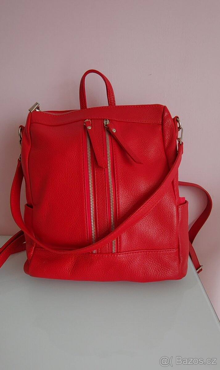 Prodám červenou koženou kabelku, italská zrnitá kůže, možno nosit přes rameno i jako batůžek. Rozměry 32x34x16 cm. Na vnější straně 2 zipové kapsy, po stranách 2 otevřené kapsičky, na zadní straně zipová kapsa.