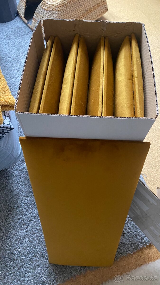 Prodám nové čalouněné panely hořcicové barvy, samet, velikost 30x80, 9 ks za 900 Kč.
