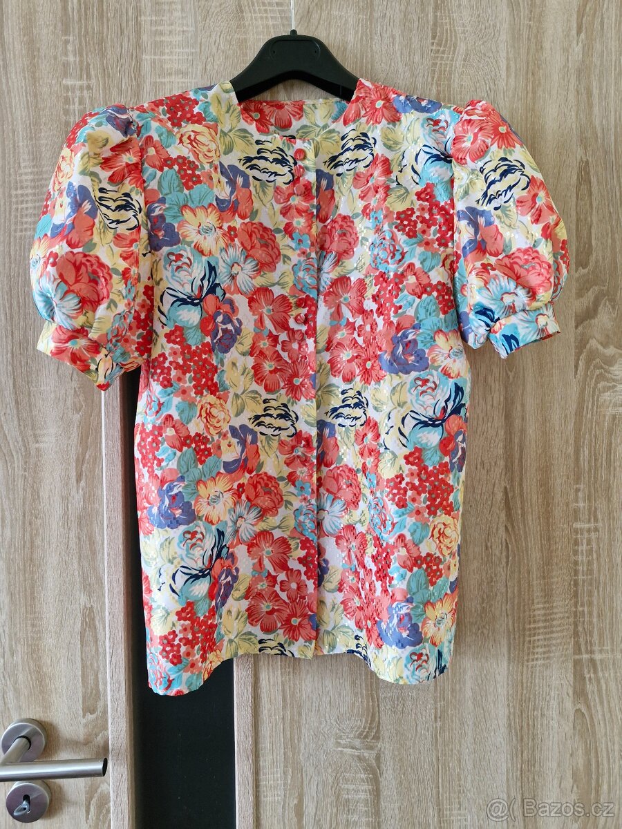 Dámská halenka rovného střihu, který lze doplnit páskem, zapínání na patentní knoflíky. Vel. odpovídá vel. 38, šíře hrudníku 50 cm, zadní délka 66 cm, délka rukávu 29 cm.