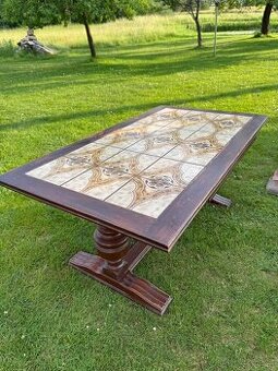 Prodám masivní dubový stůl s keramickou dlažbou ve vrchní desce. Stůl je v pěkném stavu, pevný a stabilní, s krásně tvarovanými nohami. Dlaždice jsou originální, v dekoru květin a ornamentů, dlaždice místy bohužel popraskané.