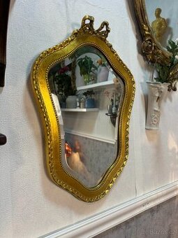 Výška 55,5 cm, šířka 39 cm. Elegantní nástěnné zrcadlo s bohatě profilovaným, zlaceným rámem ve stylu Ludvíka XV. Charakteristické zvlněné linie, plastická výzdoba a jemné ornamenty dodávají kusu noblesní francouzský výraz. Horní část zdobí stylizovaný dekor s motivem mašle a florálních prvků.