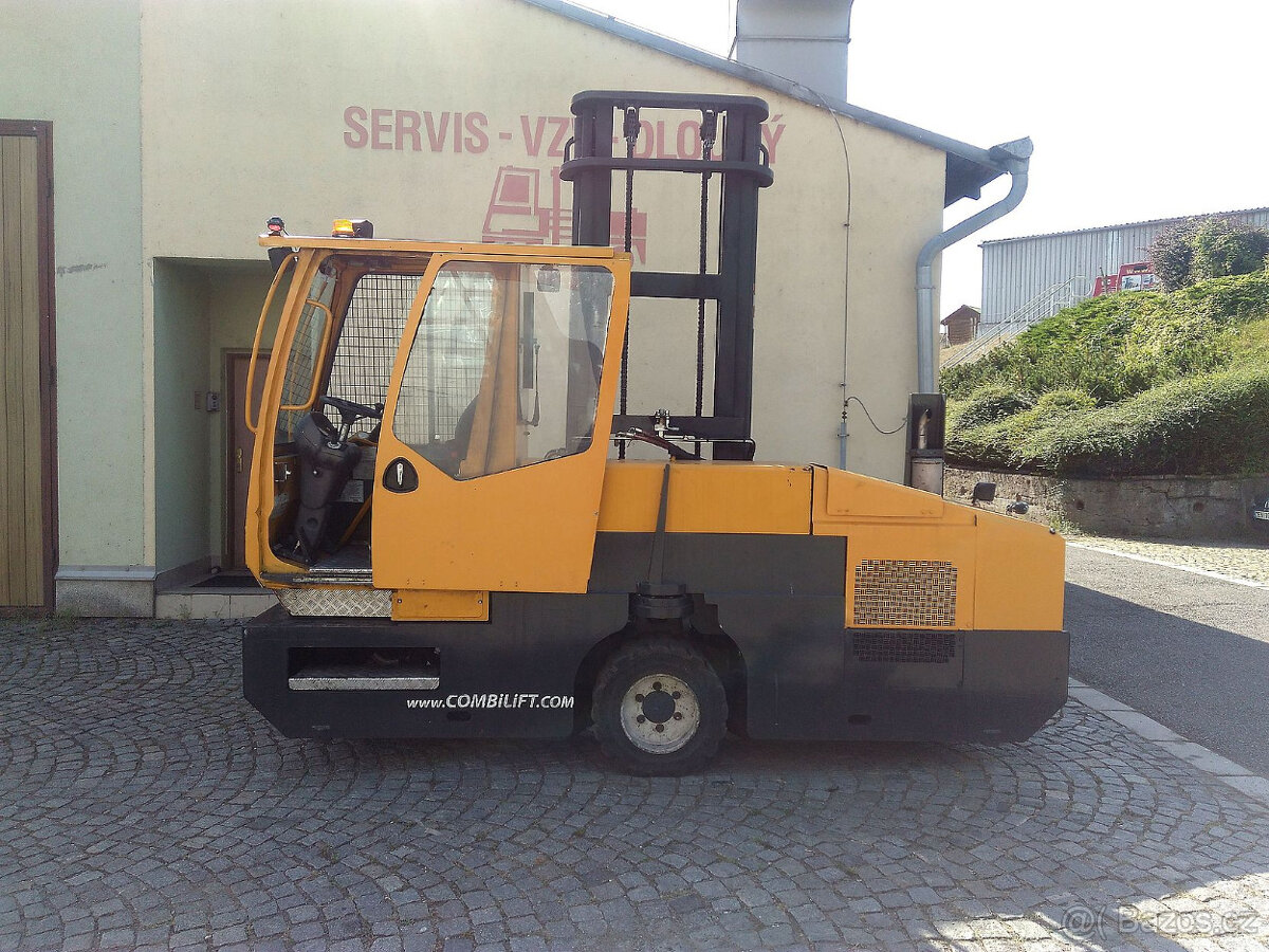 Čtyřcestný-boční vysokozdvižný vozík Combilift C4500, nosnost 4500Kg, výška zdvihu 4,5m (duplex), hydraulicky přestavitelné vidle, r.v. 2007. Velice dobrý stav po servisu a údržbě, nová TK. Uvedená cena je bez daně z přidané hodnoty.