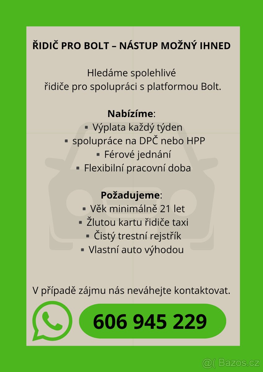Hledáme řidiče a řidičky do naší flotily Bolt. Požadujeme: – platný řidičský průkaz – průkaz řidiče taxislužby – čistý trestní rejstřík – chuť pracovat a vydělávat Nabízíme: – flexibilní pracovní dobu – férové a transparentní podmínky – možnost jezdit vlastním vozidlem – zázemí a podporu flotily - Výplaty TÝDNĚ Vhodné jako hlavní i vedlejší příjem. 📱 Kontakt (WhatsApp / telefon): 606 945 229 Ústecký kraj / Praha a okolí