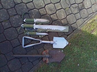 Prodám vojenskou mačetu, délka čepele 45 cm, 1x nůž 18 cm. 1x nůž 16 cm, 2 ks vojenská lopatka. Vše jako celek. Vhodný dárek pro sběratele.