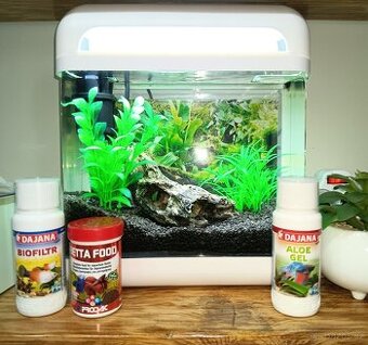 Moderní akvarijní set s objemem 7 litrů pro začínající akvaristy i zkušené. Filtrace a osvětlení je umístěno v krytu a tak si můžete vychutnat pohled na Váš podvodní skvost bez rušivých elementů. Set obsahuje velice úsporné a efektivní LED osvětlení. Podání barev 8,500K - perfektní pro vybarvení rybek. Výkon na litr je ideální pro pěstování nenáročných rostlin. Výtok z filtrace je realizován skrze malinký vodopád, který do svého okolního prostředí naladí relaxační atmosféru. Rozměry akvária: cm - Délka: 26cm cm - Šířka: 13.5cm cm - Výška: 29.5cm Výkon osvětlení: 3W Průtok vody: 300 l/h Akvárium je ze skla, dno a víko z bileho platu. K akváriu je vybavenív hodnotě 1600,-Kč: nebylo součástí setu. Topítko pro Betty s termostatem na 27 stupňů - 500,-Kč akvarijní písek černý 0,8-1,2mm 3kg - 200,-Kč přírodní pařez - 180,-Kč dvě plastové rostliny - 150,-Kč+ 4 vyměnitelná pozadí za akvárium - 200,-Kč skoro plné: biofiltr na úpravu vody - 150,-Kč krmení pro betty 100,-Kč aloe gel na zjemněn