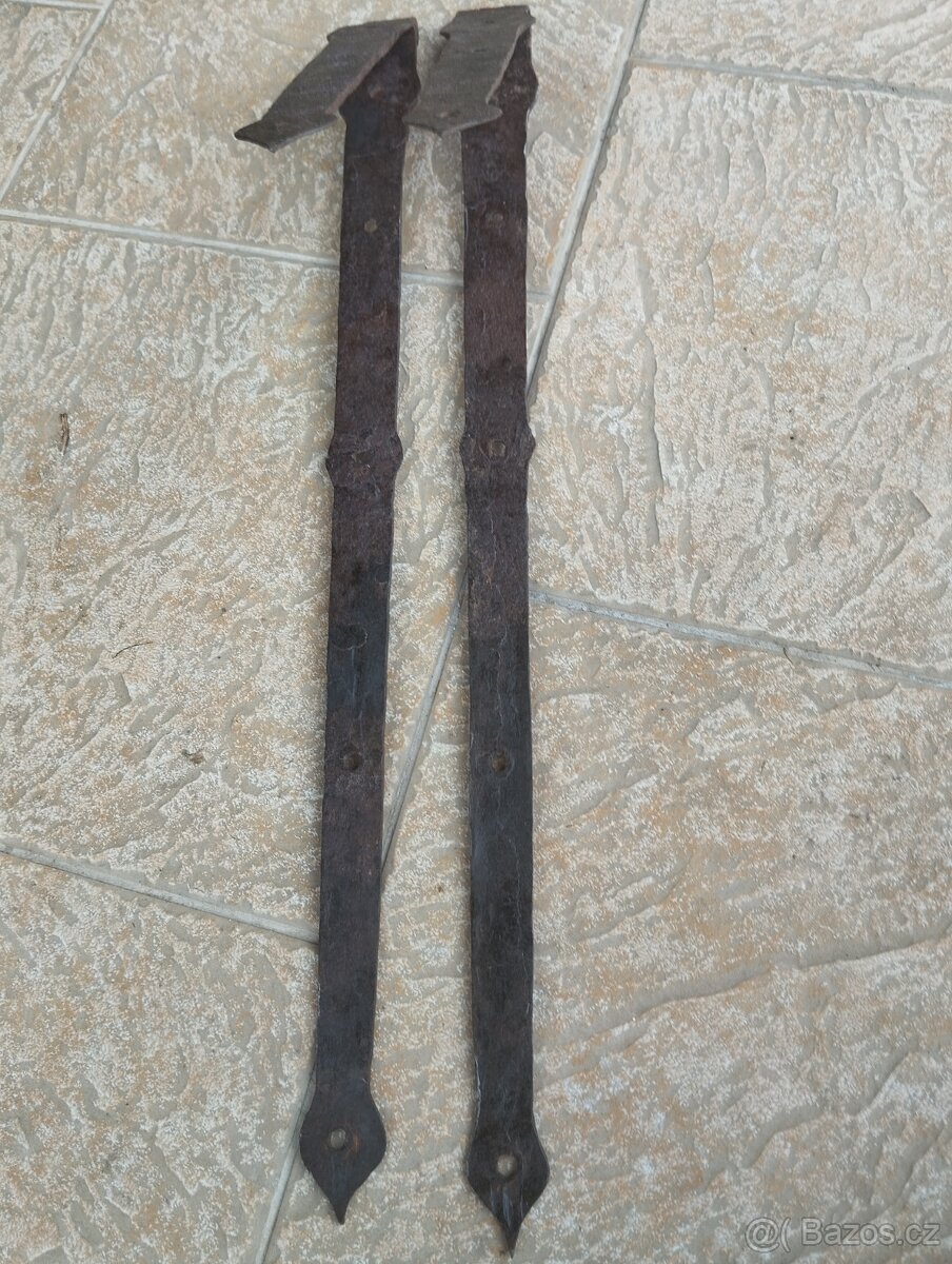 Nabízím 2 ks starých ručně kovaných pantů a zámek s klíčem /vše ze staré demontované skříně/. Panty celk.délka 84 cm, západka zámku 25 mm.