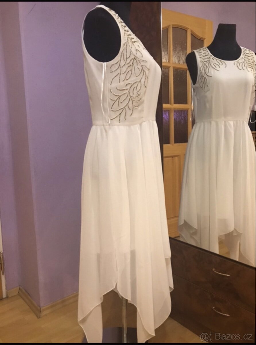 Nové šaty s cípatou sukní a dekoltem s kamínky.