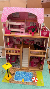 Prodám dřevěný domeček pro panenky s příslušenstvím viz. foto. Pěkný stav. Velikost 90x60x30cm. Pouze osobní odběr Jablonec nad Nisou.