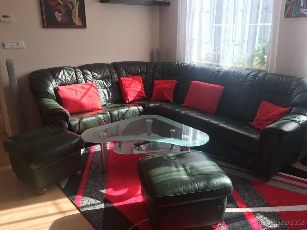 Prodám zachovalou starší koženou sedačku zelené barvy dlouhou 220cm x 270 cm a k tomu dva taburetky za cenu 5000,- Kč. Sedačka není rozkládací a nemá úložný prostor.