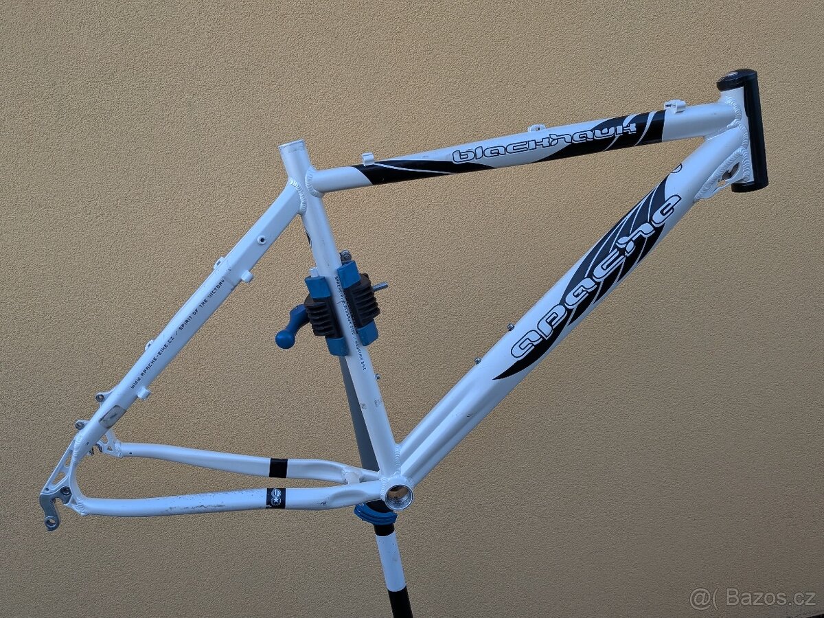 Prodám Al MTB rám Apache Blackhawk pro kola 26"", velikost 19" (délka horní rámové trubky střed-střed 56,5 cm, délka sedlové trubky střed-vršek 48,5 cm). Rám je v pěkném stavu, zachovalý. Součástí hlavové složení, sedlovka pasuje 27,2 mm, smyk 31,8 mm. Osobní předání je možné ve Zruči u Plzně, posílám Českou poštou a přes Zásilkovnu.