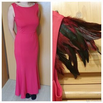 večerní/plesové šaty. Délka cca 130 cm. Peří lze odebrat, pěkné bez něj. barva starorůžová, velikost 36. osobně Praha 5, nebo balíkovnou/zásilkovnou.