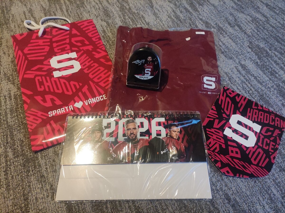 Cena: Nabídněte. Prodám nové věci HC SPARTA PRAHA, tričko vel. L, stolní kalendář 2026, sběratelský puk AARON IRVING s podpisem v obalu a dárkovou tašku.