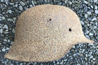 Helma byla vykopaná cca před 20lety v místech bojů na Ostravsku, přestože je hodně rezavá je ještě pevná, na horní straně je promáčklá a jedna malá dírka (vidět proti světlu) jinak nečištěno jen kdysi po nálezu omyté vodou, viz foto