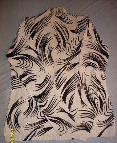 Sváteční halenka nová hřejivá, pružná, bíločerná s dlouhým rukávem , XL, 95% bavlna, 5% lycra. Přes prsa 96cm, délka 65cm, délka rukávu 73cm, boky 134cm.