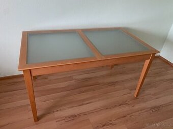 Prodám rozkládací jídelní stůl. Materiál dýha, lesklé sklo na povrchu/ na rubu pískované. Rozměry(cm) V-74, D-140(rozložený 180), Š-80. Osobní odběr.