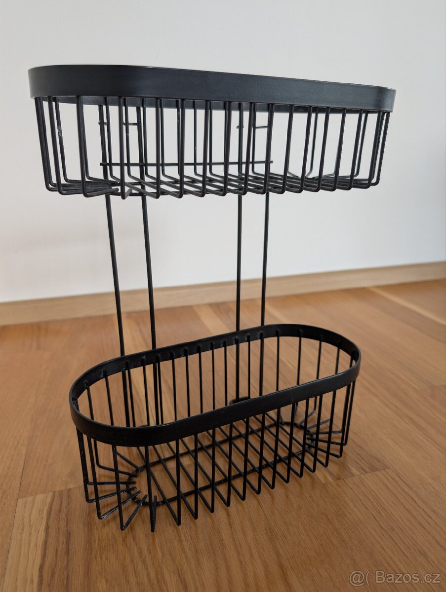 Prodám černou ocelovou dvoupatrovou poličku. Šířka 26,5 cm, výška 33 cm, hloubka 14,5 cm. Vruty a hmoždinky součástí balení. Mírně znečištěná od vodního kamene. Původní cena 600 Kč