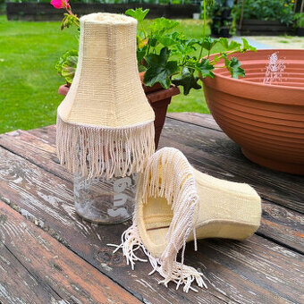 Retro látkové stínidlo k malé lampičce. Úchyt na malou žárovku. Potah není originál. výška 14 cm výška včetně střapců 22 cm šířka vrchního okraje 8,5 cm šířka spodního okraje 16 cm cena za 1 kus