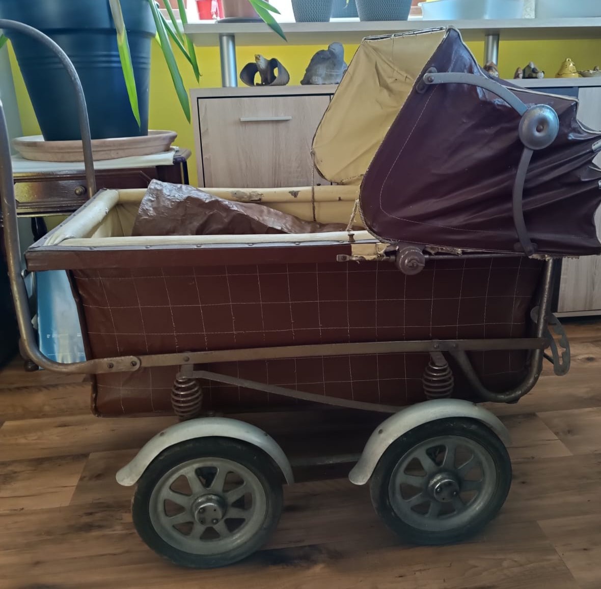 Prodám starožitný kočárek pro miminka.Chromový podvozek,bouda,korba a slída z koženky . Originál původní stav vhodný k renovaci. Stav viz foto