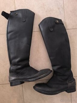 Prodám černé vysoké kožené jezdecké boty se zipem a gumou, vel. 39. Používané, ale ještě snad poslouží.
