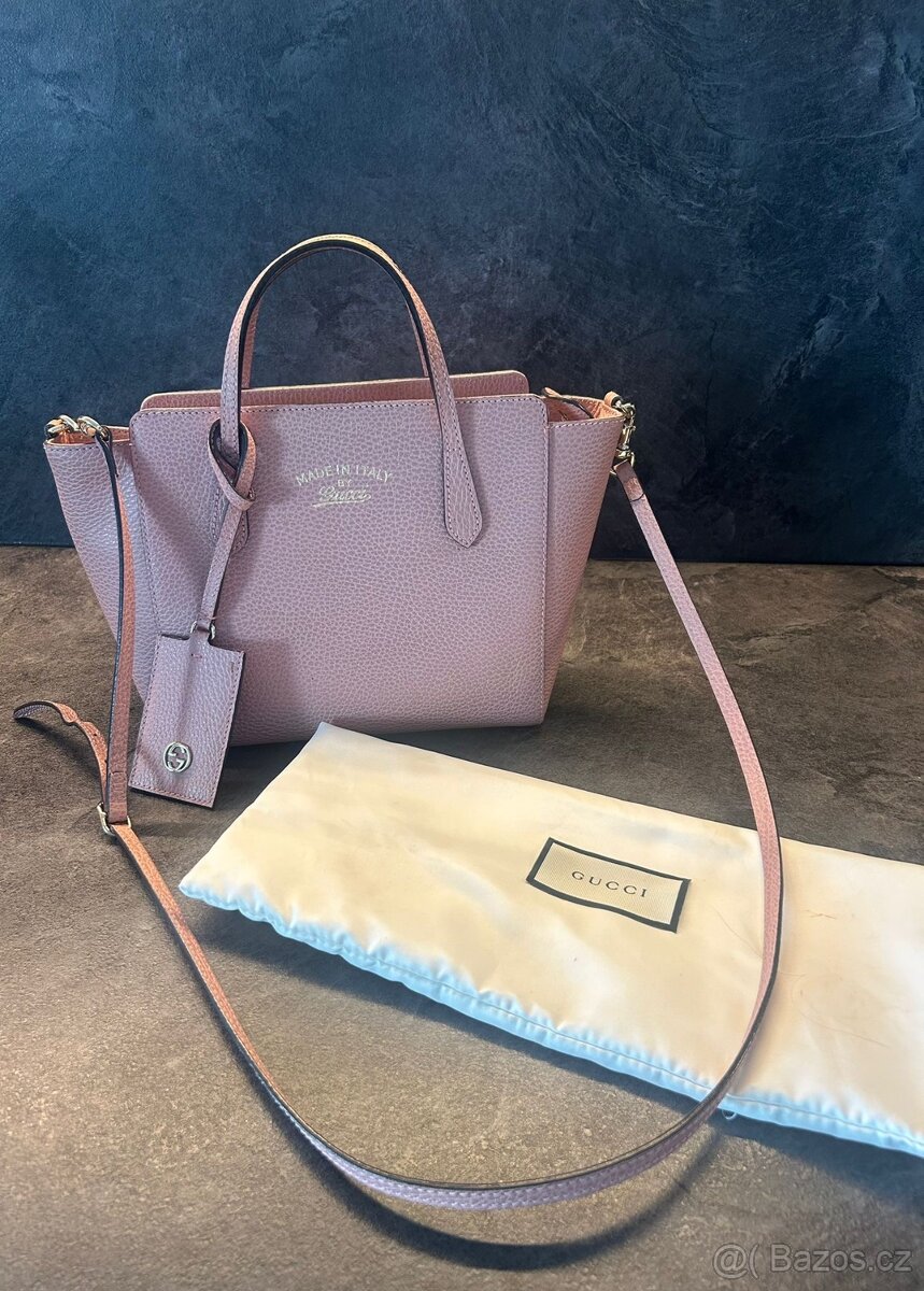 -prodam minimalne nosenou kabelku Gucci Swing Mini Leather Tote Bag Old Pink, ktera byla malo nosena, v krasnem stavuz, jak je videt na fotografiich, -sirka 22 cm, vyska 19 cm a hloubka 11 cm, -vcetne dustbagu a potvrzeni originality Legit App, -prodam za 13.999,-Kc. Osobne v Praze nebo odeslu.
