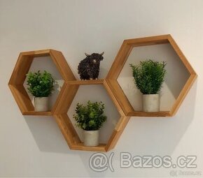 Prodám dubovou poličku ve tvaru šestiúhelníku,včelího plástvu. Rozměr 35x40cm hloubka 10cm. Ošetřena tvrdým voskovým olejem Osmo Cena za 1ks