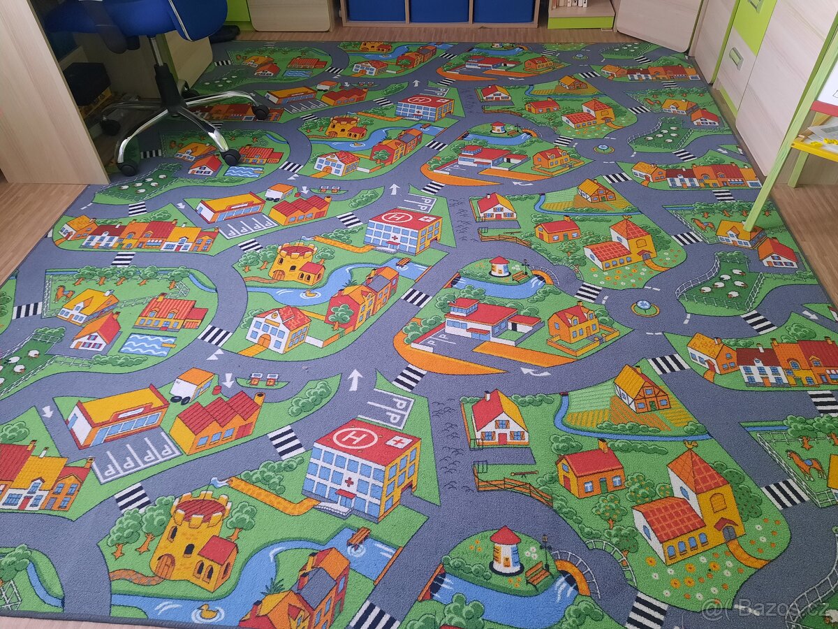 Krasny dětský koberec se silnicemi. Nezniceny, obsity, snadno se udržuje.