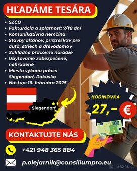 Podmienky a požiadavky: - SZČO - Fakturácia a splatnosť: 7/18 dní - Komunikatívna nemčina - Stavby altánov, prístreškov pre autá, striech a drevodomov - Základné pracovné náradie - Ubytovanie zabezpečené, nehradené - Miesto výkonu práce: Siegendorf, Rakúsko - Dlhodobý projekt - Hodinovka: 27,- € - Nástup: 16. februára 2025
