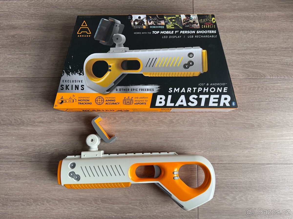Herní konzole ARKADE A1 pro mobilní zařízení Android a iOS. Konzole hráči umožní dosažení lepších herních výsledků prostřednictvím intuitivního ovládání a rychlejší reakce ve hře. ARKADE Blaster je pokročilý ovladač sledování pohybu Bluetooth® kompatibilní s mnoha špičkovými mobilními střílečkami pro jednu osobu Kompatibilní s populárními on-line mobilními hrami pro Android a iOS • Tail Gun Charlie, Moorhuhn, Last Hope Snipe, Savior Complex, Robot War Robokrieg, Natural Born Soldier, Drone War, Modern Combat 5 (pouze Android) • Blaster má vestavěný gyroskop pro precizní sledování pohybu • Extrémní přesnost podporuje vaše zaměření na cíl • Obsahuje 13 funkčních tlačítek, které umožňují hráči ovládat hru více prsty • Dá se používat s většími i menšími telefony • Vydrží až 90 hodin hraní na jedno nabití. Doba nabíjení 1,5 – 2 hodiny • Bez nutnosti párovat s telefonem. Hra se automaticky připojí ke konzoli • Možnost sdílení hry prostřednictvím Livestream kanálu Twitch nebo YouTub