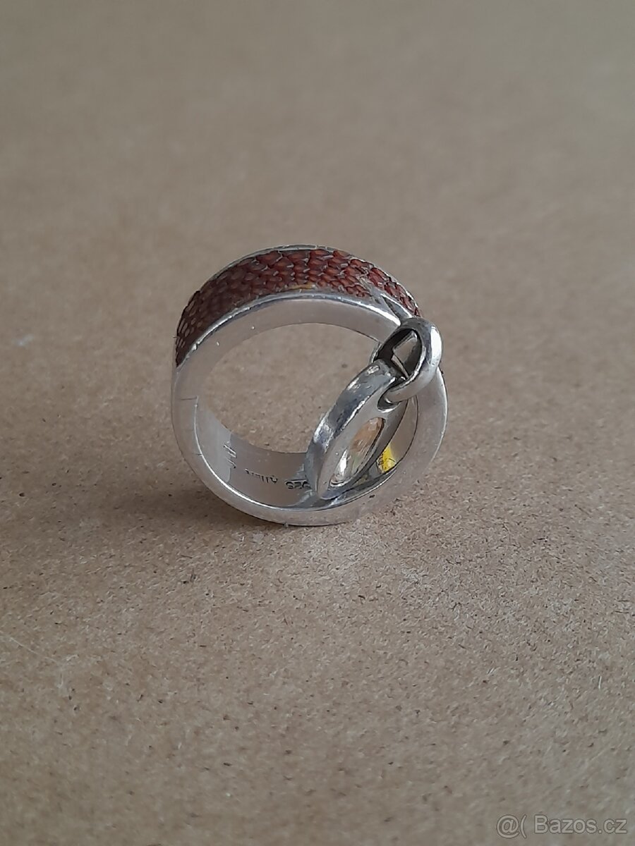 Luxusní prsten značka Allure,známa kombinacemi stříbra a drahých kamenů . Tento masivní prsten je zdobený inovativním materiálem imitujícím kůži . Přívěsek je o délce cca 1,3 cm, vsazen broušený citrín . Prsten je o šířce 0.9 cm . Vnitřní průměr obroučky 1.7 cm. Obroučka je masivní tedy prsten ač velikosti vhodný 52 - 53 je spíše menší , proto měřeno uvnitř obroučky. Prsten je ve skvělém stavu, velmi exkluzivní . Řádně puncován, značen značkou klenotnické firmy. Ryzost stříbra 925/1000 váha 11,7 g. Prsten velmi dobře vypadá i nošen na malíčku. Zásilkovna 95 Kč. Možné osobní převzetí.