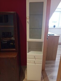 Prodám bílou koupelnou skříňku(vhodná kamkoli jinam)vzadu zrdcadlo, prosklená matná dvířka ,dvě police,dva šuflíky,dole úložný prostor.pouze osobní odběr.vyska 182cm,hloubka 30cm, šířka 35cm. Vzadu na zrcadle oddelatelny polystyren skrz zeď,na dvířka h kousek izolepy.